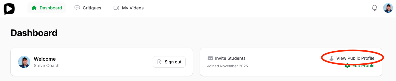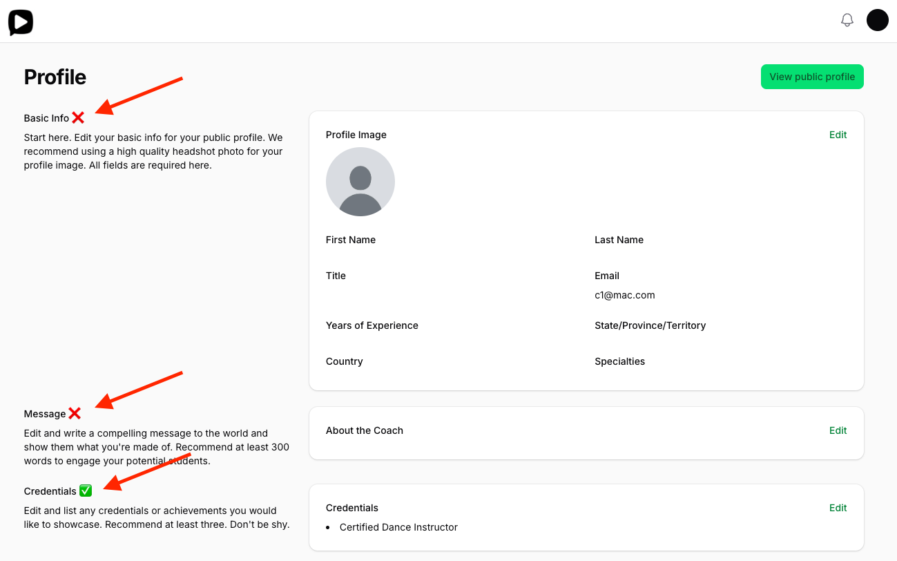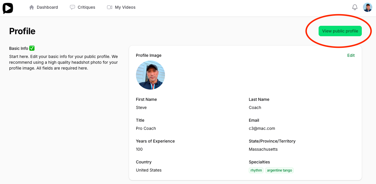 You can view your public profile any time to see how it would look from your Profile page or your Dashboard page. This is the public view the students will see on the platform so please take notice on the accuracy, spelling, and grammar of your profile.