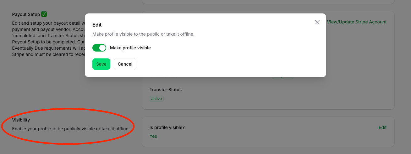 Once you're happy with your profile, you can make it public so it's visible. Originally, your profile is hidden. All you have to do is flip the switch on in the Visibility section. Note: you can make your profile visible anytime even if your profile is not complete, however, students will not be able to purchase a critique request until all the sections are complete.